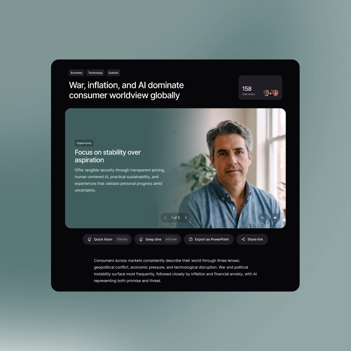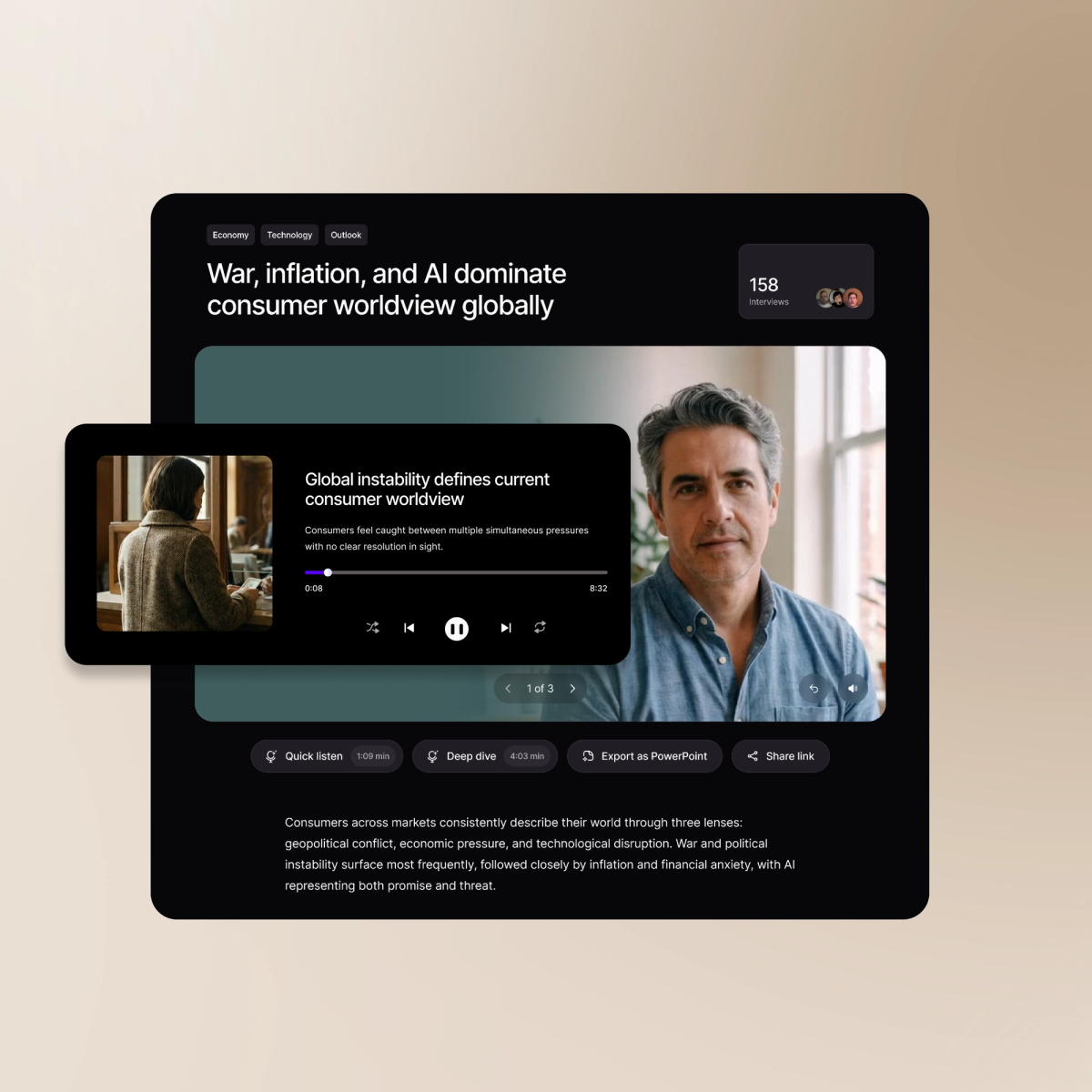 Bring the customer into every meeting. Access human understanding through formats designed for the modern professional: listen like a podcast, scroll like an article, or watch like a high-fidelity showreel.